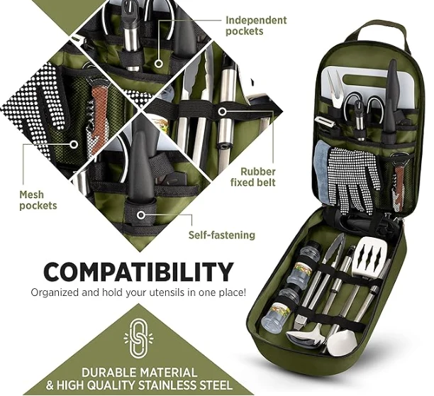 กระเป๋าเครื่องมือตั้งแคมป์กลางแจ้งแบบพกพาแต่ละเครื่องใช้มีกระเป๋าที่กำหนดของตัวเองดังนั้นหน่วยจึงไม่ได้รับรอยเปื้อนรอยขีดข่วนหรือความเสียหายในการจัดเก็บหรือระหว่างการขนส่ง ให้การเข้าถึงอุปกรณ์ทำอาหารของคุณได้ง่ายและติดตั้งซีลซิปที่ปลอดภัย