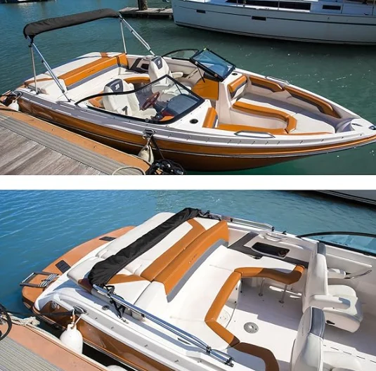 Bimini เรือสแตนเลสที่ทำจากผ้าใบโพลีเอสเตอร์ระดับ 600D ทางทะเลพร้อมการเคลือบ PU สองครั้งรองเท้าบู๊ตจัดเก็บของเราให้การป้องกันที่ดีจากแสงแดดน้ำทะเลฝนและฝุ่น